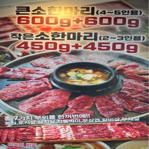 작은 소 한 마리(900g, 2~3인용 )는 64,000원, 큰 소 한 마리(1,200g, 4~5인용)은 79,000원, 1인당 상차림비는 2,000원이며, 셀프바를 통해 상추, 깻잎, 파채, 마늘, 고추, 김치, 장아찌 등 다양한 반찬을 무제한으로 이용할 수 있습니다. 된장찌개도 기본 상차림에 포함되어 있으며 리필이 가능합니다. 매장 내부는 화이트 톤의 깔끔한 인테리어와 통유리 창으로 개방감을 주며, 약 15개의 4인 테이블이 마련되어 있어 가족 모임이나 회식 장소로 적합합니다. 사장님의 친절한 서비스와 고기에 대한 진심 어린 자세도 이곳의 큰 장점 중 하나입니다. 금련산역 1번 출구에서 도보로 약 1분 거리에 위치해 있어 접근성이 뛰어나며, 맛과 가성비를 모두 갖춘 소고기 전문점으로 추천할 만한 곳입니다.